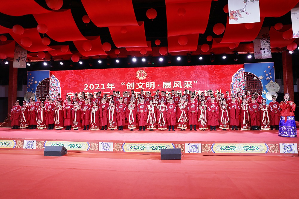 12月6日下午,由宁德市总工会主办的2021年宁德市“创文明、展风采”第三届青年职工文明集体婚礼,在宁德市体育中心篮球馆举行。宁德市委、市政府主要领导出席集体婚礼活动,共同见证44对新人一生中最重要、最美好、最幸福的时刻。青拓集团有限公司工会主席、行政总经理钟盛江受邀参加观礼,并为青拓集团的4对新人送去最真挚的祝福。