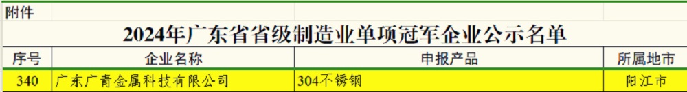 近日,广东省工业和信息化厅公示2024年广东省省级制造业单项冠军企业通过名单,广东广青金属科技有限公司凭借“304不锈钢”产品成功入选2024年广东省省级制造业单项冠军企业。
