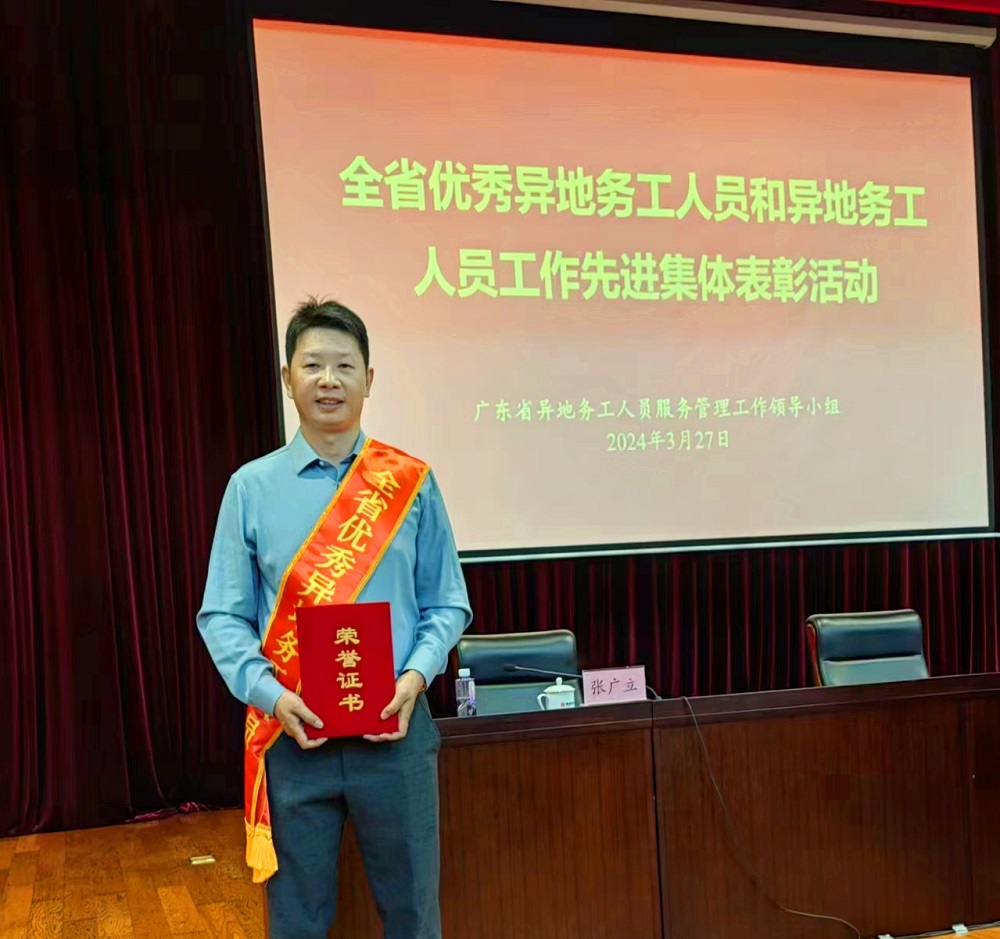 荣获“广东省优秀异地务工人员”