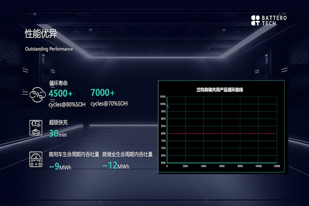 提升循环性能方面,兰钧新能源采用均匀包覆的纯相正极材料,有效抑制杂质溶出,SEI膜增韧,有利于降低界面副反应,保证产品循环寿命可达到7000次@70%EOL,stepcharge/1C。