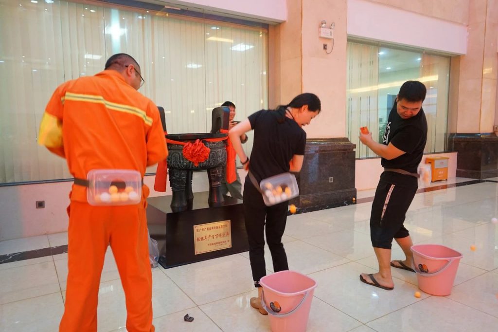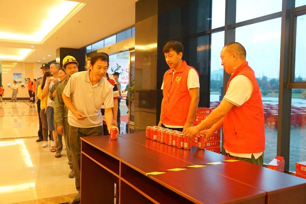 员工们自觉排起长龙,积极参与“手舞足蹈、圈套大象、母鸡下蛋、沙包投掷、巧取饮料”等游戏,通过收集游戏券兑换到相关礼品。在“母鸡下蛋”环节,参与者将手背在身后,用膝盖夹着乒乓球走到水桶旁,放松膝盖将乒乓球放到水桶中,有趣的游戏设计深受员工欢迎。