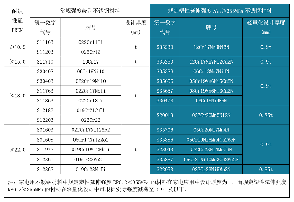 经济型高强度不锈钢,包括QN系列奥氏体不锈钢及QD2001双相不锈钢在保持良好耐蚀性、焊接性和冷加工性的基础上显著提升了强度,可助推集装箱及家电等领域的产品轻量化设计。新发布的行业标准中推荐,高强度不锈钢相对常规产品可减薄10%-15%(详见表1~表3),这对于产业链节能减排和可持续绿色发展具有重要意义。
