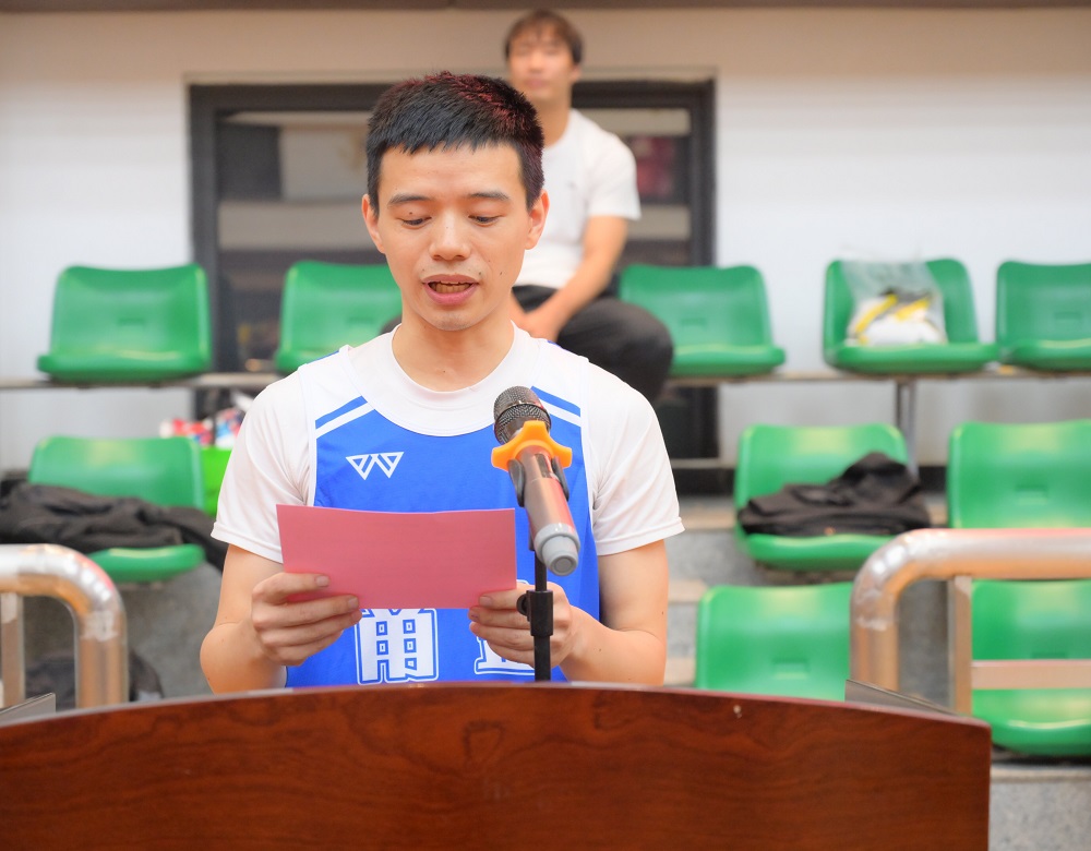 裁判员代表谢哲敏和运动员代表兰浩鹏分别庄严宣誓,并预祝第十二届篮球联赛取得圆满成功。