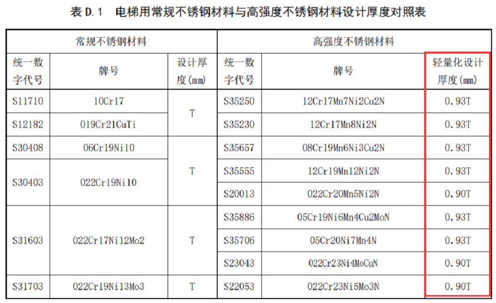 电梯行业常规不锈钢材料以430、443、304、316L等牌号为主,但这些牌号屈服强度偏低,通常在300Mpa左右。高强度不锈钢实际屈服强度达到400MPa以上,是常规电梯用不锈钢的1.3倍以上,能够承受较大的载荷和振动。该标准以保证电梯安全稳定运行为基础,在行业内首次形成了电梯用常规不锈钢材料与高强度不锈钢材料设计厚度对照表,高强度不锈钢材料设计厚度相比常规不锈钢材料可减薄7%~10%。通过不锈钢材料轻量化设计可减轻电梯自重,从而减少电梯运行能耗,高度契合电梯行业低碳绿色发展理念。