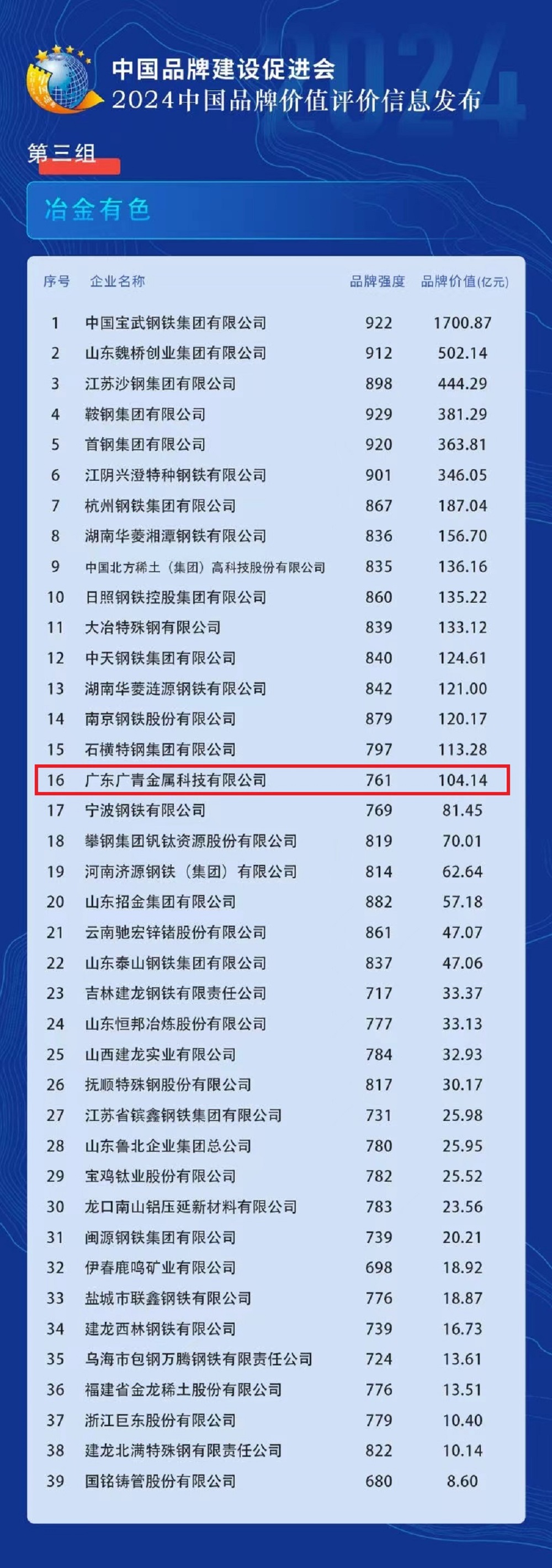 5月11日,在第八个中国品牌日到来之际,新华社、中国品牌建设促进会、中国资产评估协会、《中国品牌》杂志社等单位在浙江德清联合发布“2024中国品牌价值评价信息”。广东广青金属科技有限公司以104.14亿元的品牌价值成功上榜,是冶金有色领域唯一上榜的广东品牌,位列全国冶金有色领域第16位。