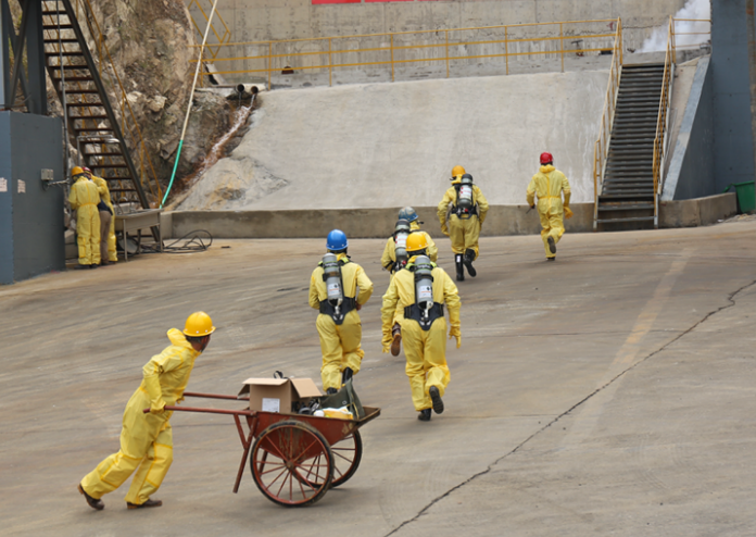 At 10:00 o’clock, with the order of CHENG Changji, the emergency drill started. During the drill, the rupture of the acid tank valve flange was simulated, which was the cause of the leakage of sulfuric acid and the burn of the operators. The acid workshop quickly activated the workshop-level environmental contingency plan, and conducted an on-site alert, evacuation, rescue including closing the tank valve and pumping the leakage sulfuric acid into the emergency pool.